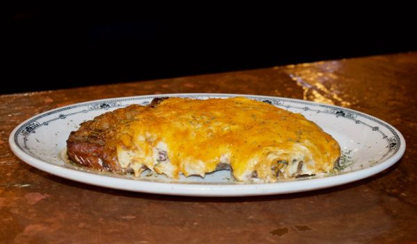 Smothered in mushrooms and swiss cheese
