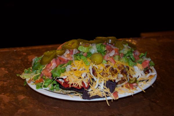 Classic nacho chips topped with cheese, lettuce, diced tomato, onion, jalapenos, salsa, and sour cream.